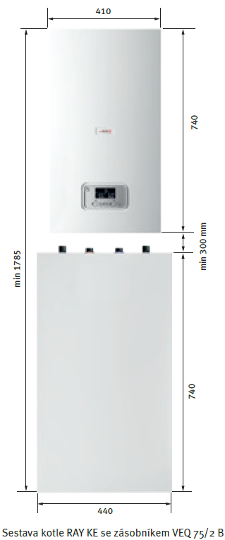 Sestava se skládá z elektrokotle Ray, externího zásobníku TV VEQ 75/2 B o objemu 68 litrů, a hydraulické propojovací soupravy 0010027587 (trojcestný ventil a NTC čidlo