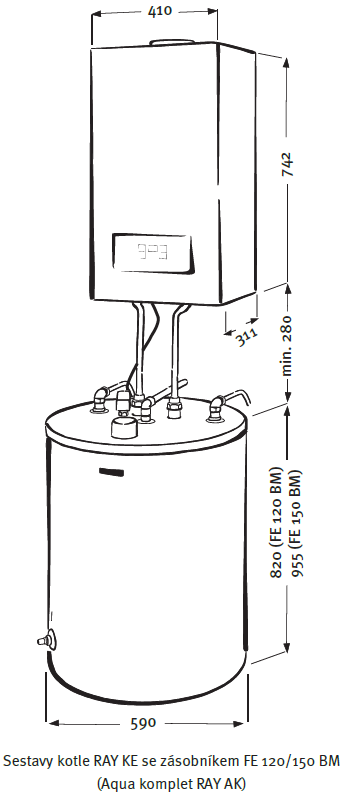Sestava se skládá z elektrokotle Ray, externího zásobníku TV VEQ 75/2 B o objemu 68 litrů, a hydraulické propojovací soupravy 0010027587 (trojcestný ventil a NTC čidlo