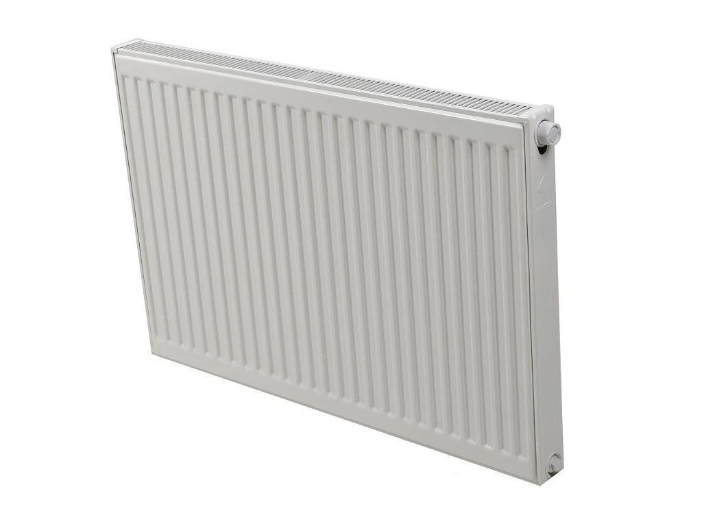 Typ VK 21 - dvoudeskový radiátor s jedním vnitřním konvektorem s integrovaným termostatickým ventilem Heimeier a spodním přípojením.